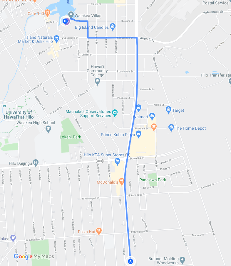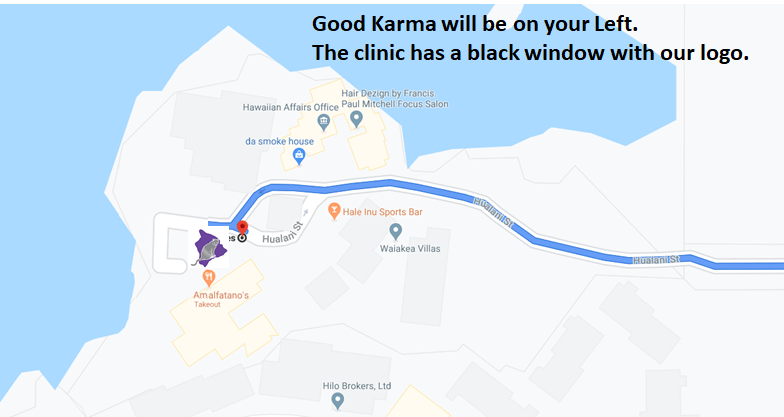 From Puna district: Follow Hawaii Belt Road toward Hilo. Take a left on Kekuanaoa Street. Take a right on Mililani Street. Take your next left on Hualani Street and follow the road almost to the end. There is a parking lot and Good Karma Spay and Neuter will be on your left. Look for our logo displayed on a black window.